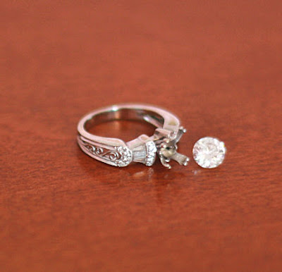 Last night started out as a typical Saturday night in my home. I was getting ready to head out to Gymboree to pick up some things for the girls. So I start to head down my stairs to grab my Uggs ( it is freezing here!) and I grab onto my railing. Well, Ava pushes my rocking chair back right against my engagement ring. Next thing I hear is a clink. I look down to see my diamond missing from my ring. There it was laying on my step. Ugh! I mean good thing I found it and it happened at home, but what a pain. Now I have to bring my ring to the jeweler to fix. She completely bent my setting. I felt so naked leaving home without my ring on. sniff, sniff...
